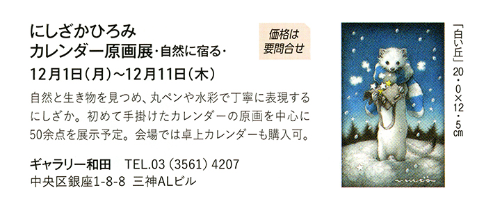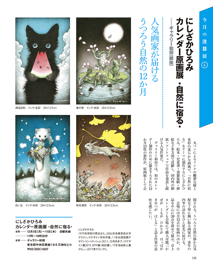 投稿日: 2025.11.242025.11.25 【掲載】アートコレクターズ2025年12月号「今月の展覧会ガイド」 アートコレクターズ2025年12月号(No.201)の「今月の展覧会ガイド」にて、ギャラリー和田での個展情報を掲載していただきました。ぜひ、本屋さんにてお手に取りください。アートコレクターズ Website・・・「にしざかひろみ カレンダー原画展・自然に宿る・」日時:2025年12月1日(月) – 12月11日(木) (日曜日休廊)会場:ギャラリー和田住所:東京都中央区銀座1-8-8 三神ALビルTEL:03-3561-4207ギャラリー和田 Websiteギャラリー和田 instagram